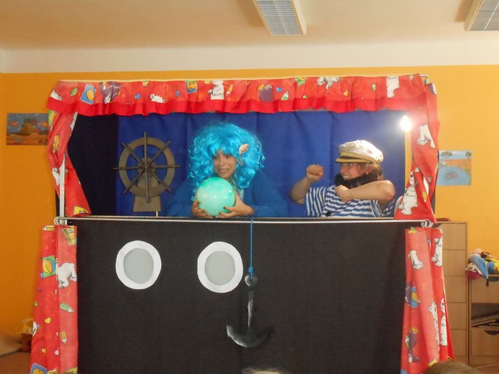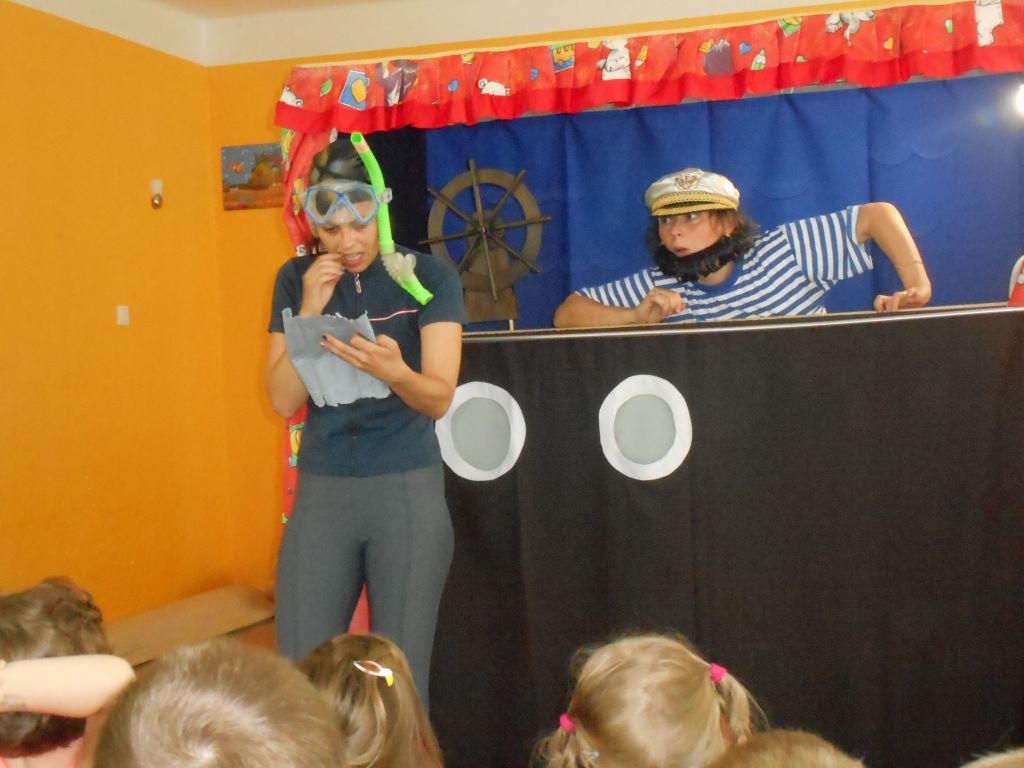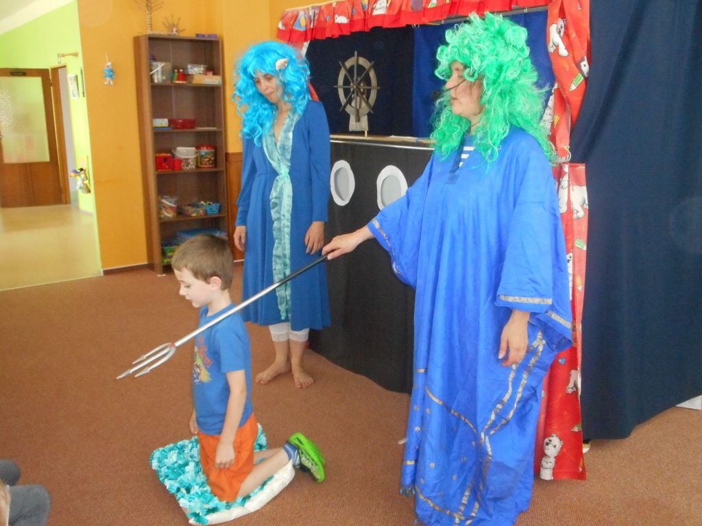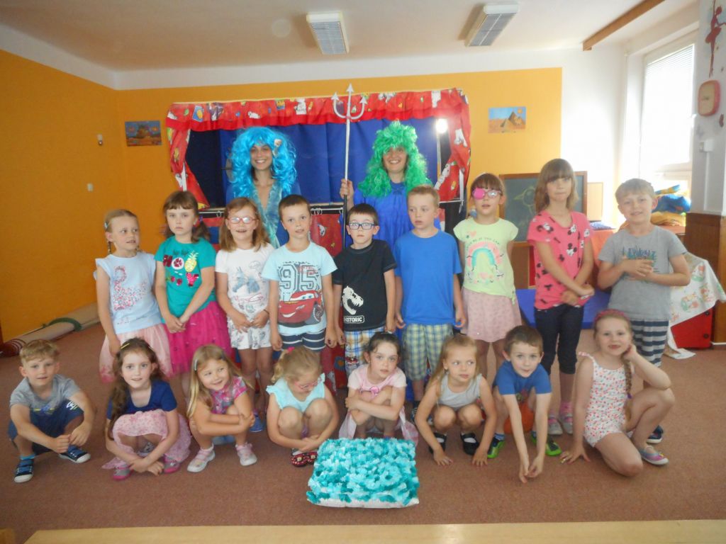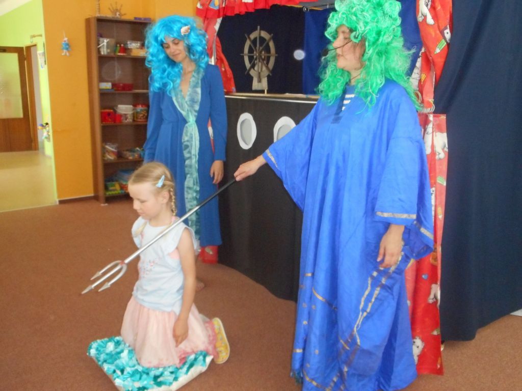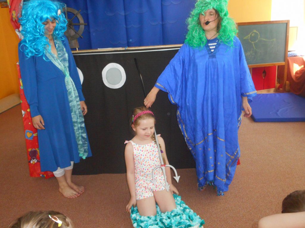 Po svačince vše vypuklo, následovalo jedno překvapení za druhým: vystoupení „Broučků“ s programem na téma- U rybníka , rozdávání „vysvědčení“ a knih na památku, krásný a velice dobrý dort - sluníčko (děti se olizovaly a chválily jeden přes druhého, jak je dobrý !!!), divadelní představení „NÁMOŘNICKÁ POHÁDKA“ . A po pohádce následovalo pasování školáků samotným vládcem moří Neptunem, kterému pomáhala jeho dcera – malá mořská panna :)