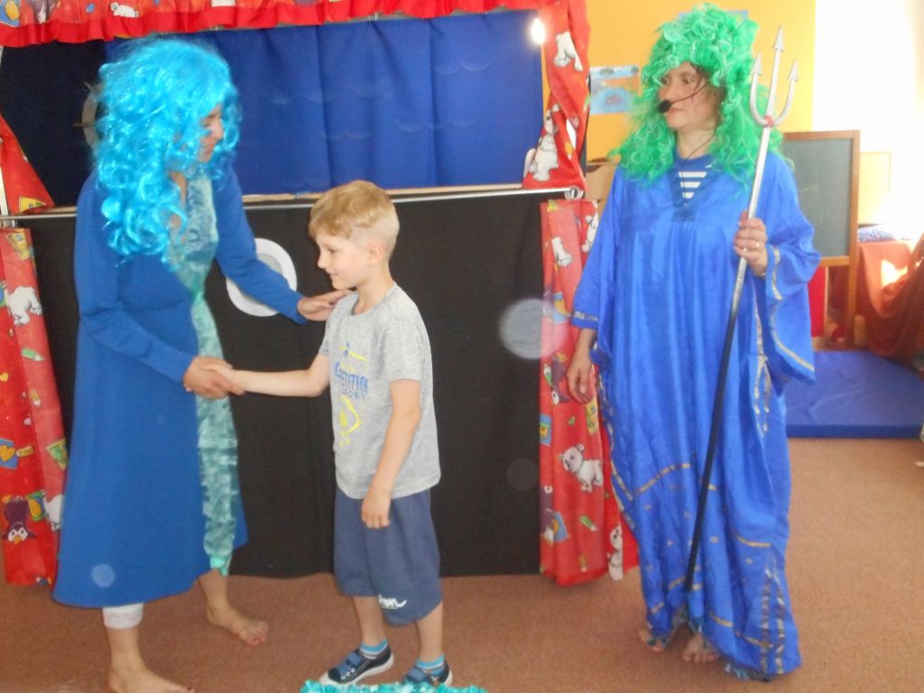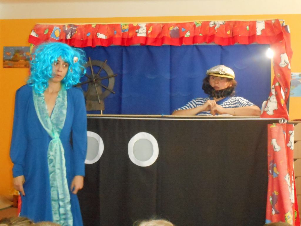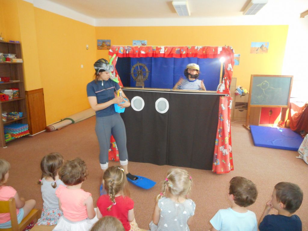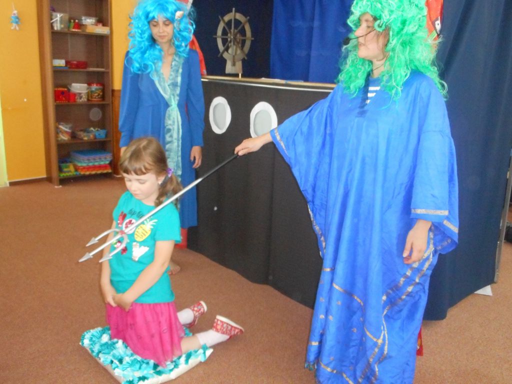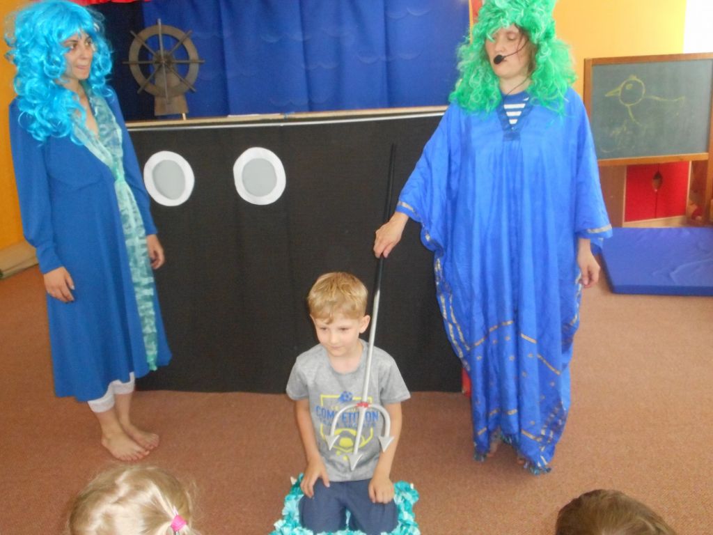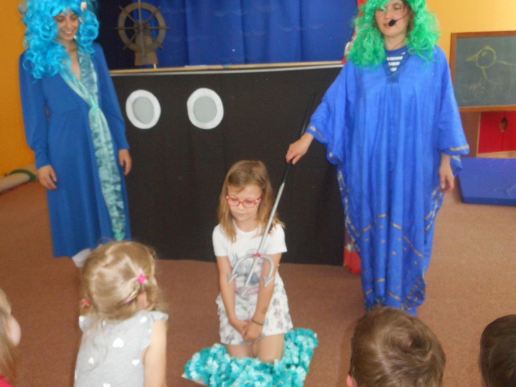 Po svačince vše vypuklo, následovalo jedno překvapení za druhým: vystoupení „Broučků“ s programem na téma- U rybníka , rozdávání „vysvědčení“ a knih na památku, krásný a velice dobrý dort - sluníčko (děti se olizovaly a chválily jeden přes druhého, jak je dobrý !!!), divadelní představení „NÁMOŘNICKÁ POHÁDKA“ . A po pohádce následovalo pasování školáků samotným vládcem moří Neptunem, kterému pomáhala jeho dcera – malá mořská panna :)