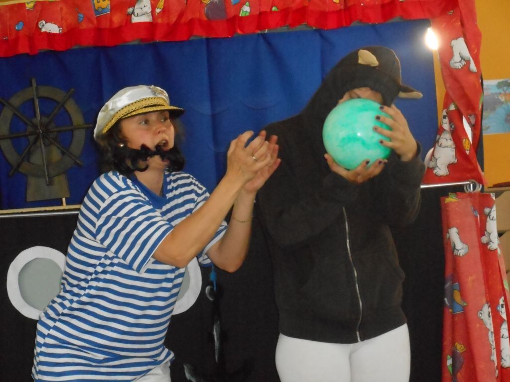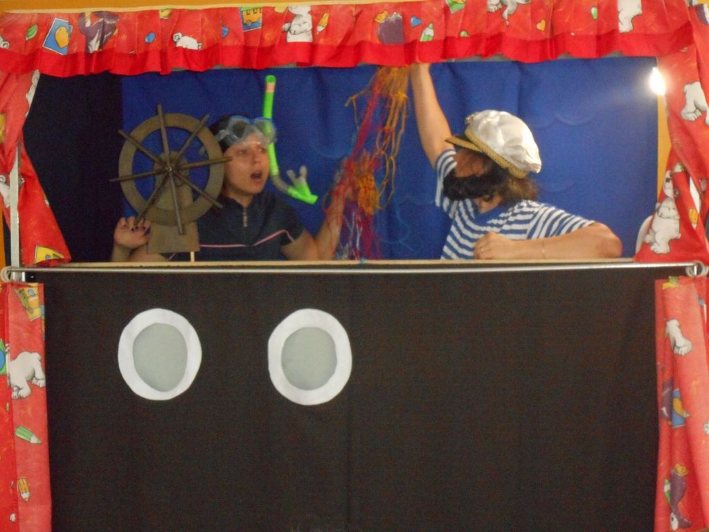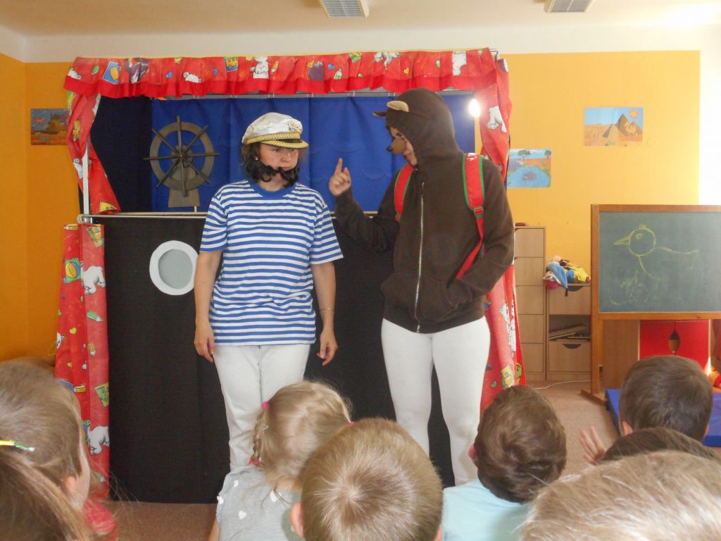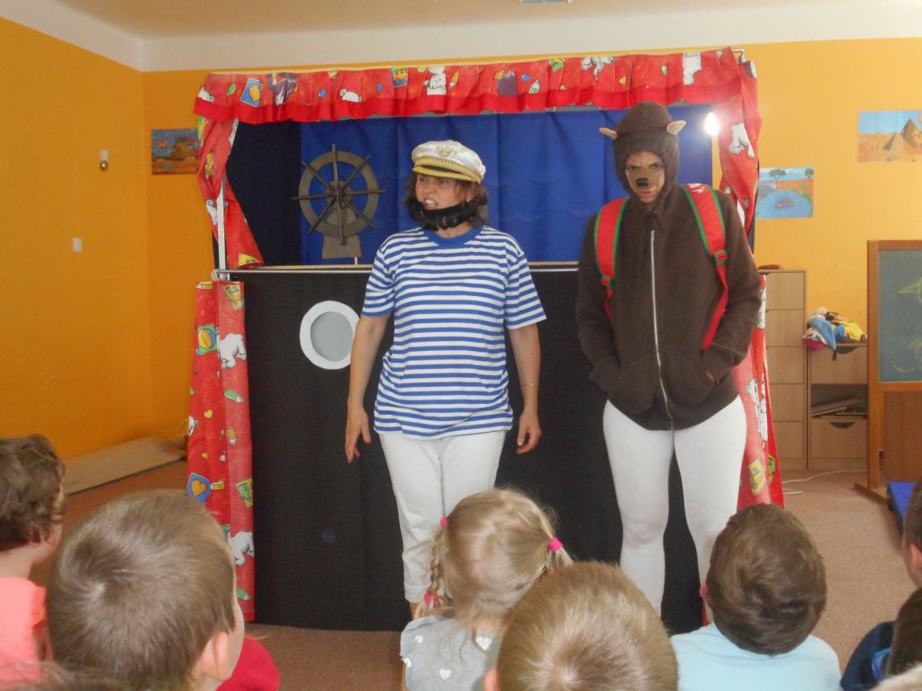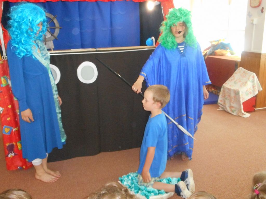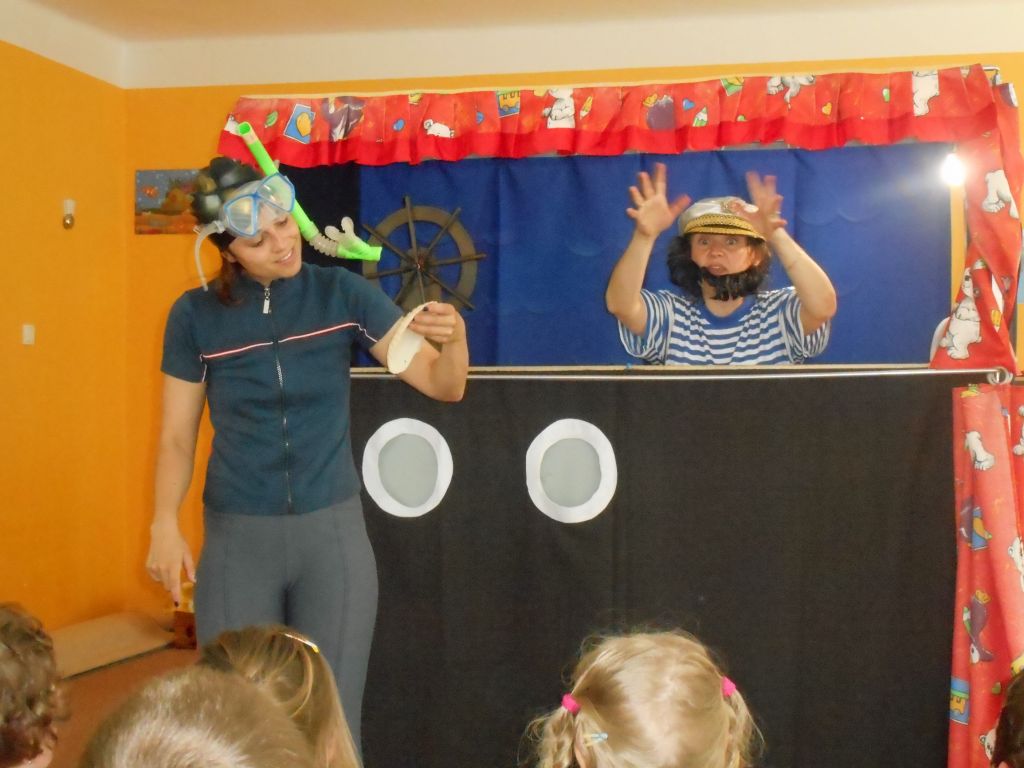 Po svačince vše vypuklo, následovalo jedno překvapení za druhým: vystoupení „Broučků“ s programem na téma- U rybníka , rozdávání „vysvědčení“ a knih na památku, krásný a velice dobrý dort - sluníčko (děti se olizovaly a chválily jeden přes druhého, jak je dobrý !!!), divadelní představení „NÁMOŘNICKÁ POHÁDKA“ . A po pohádce následovalo pasování školáků samotným vládcem moří Neptunem, kterému pomáhala jeho dcera – malá mořská panna :)